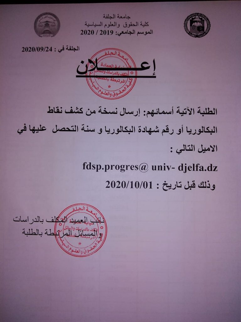 إعلان لطلبة ما بعد التدرج بخصوص عمليتي التسجيل و إعادة التسجيل للسنة الجامعية 2021/2020