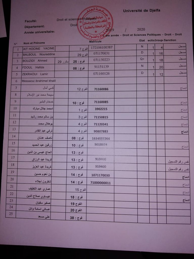 نتائج الإمتحانات لقسم القانون العام