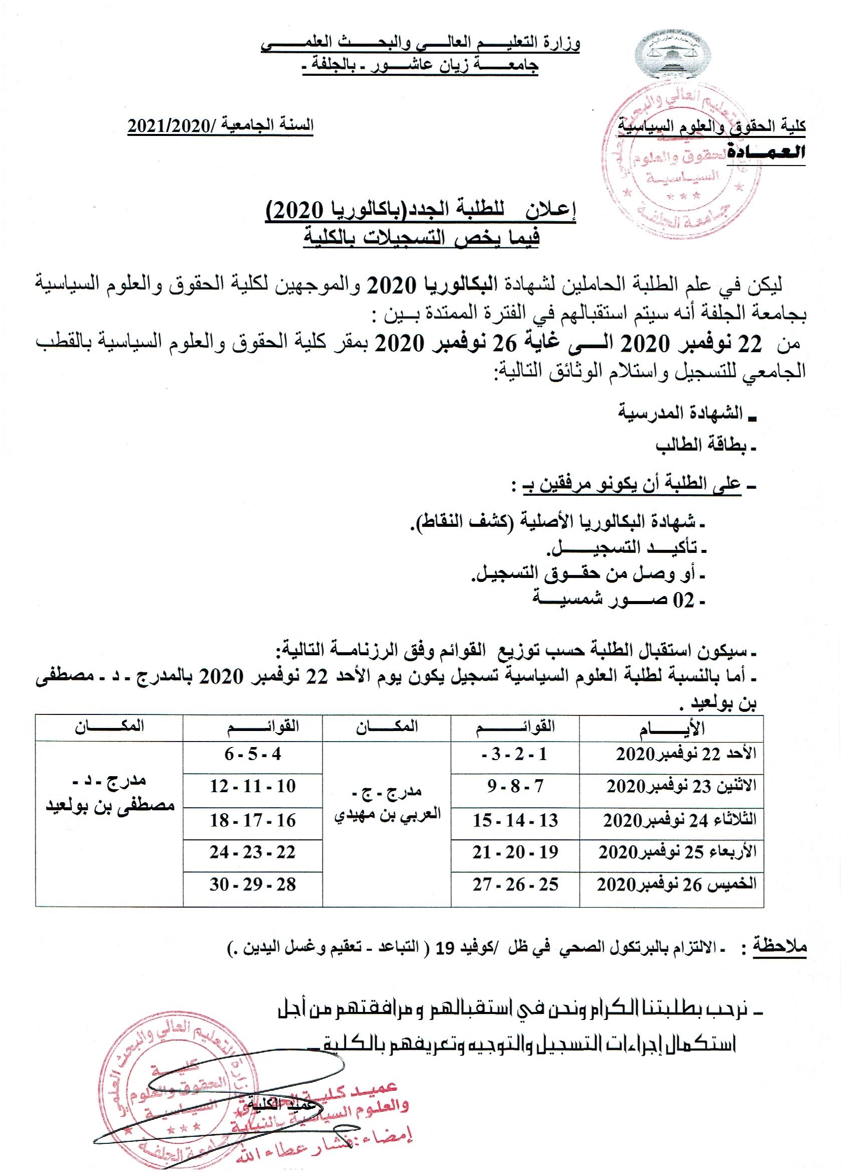 إعلان للطلبة الجدد (بكالوريا2020) فيما يخص التسجيلات بالكلية 18/11/202018/11/2020 قوائم طلبة قسم الحقوق قائمة طلبة قسم العلوم السياسية