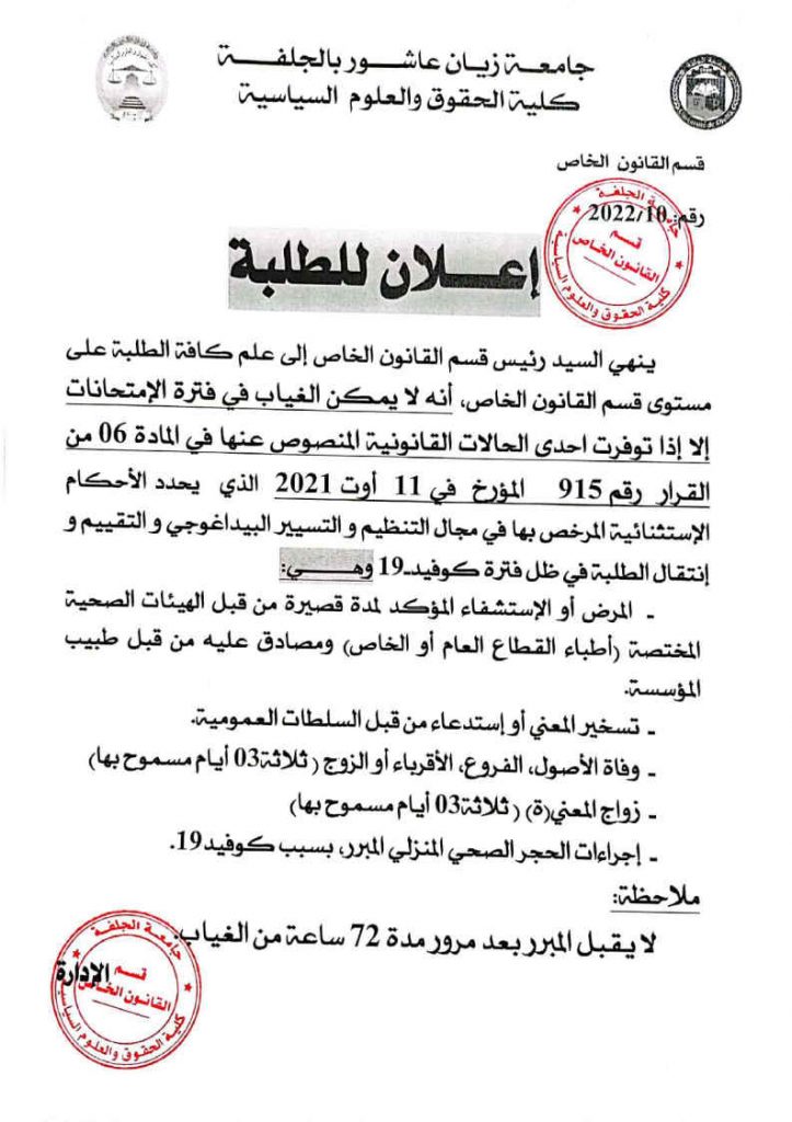 اعلان للطلبة بخصوص الغياب في الإمتحانات