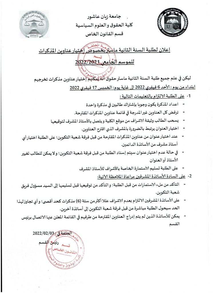 إعلان لطلبة السنة ثانية ماستر بخصوص اختيار عناوين المذكرات للموسم الجامعي 2022/2021 03/02/202204/02/2022